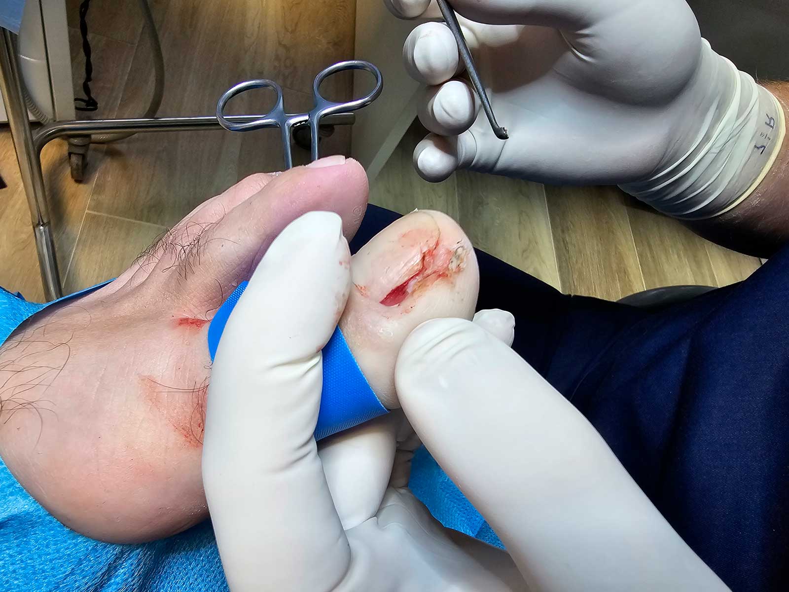 Esta matricectomía es un ejemplo real de las cirugías de uña encarnada que realizamos habitualmente en nuestra clínica podológica en Barcelona.